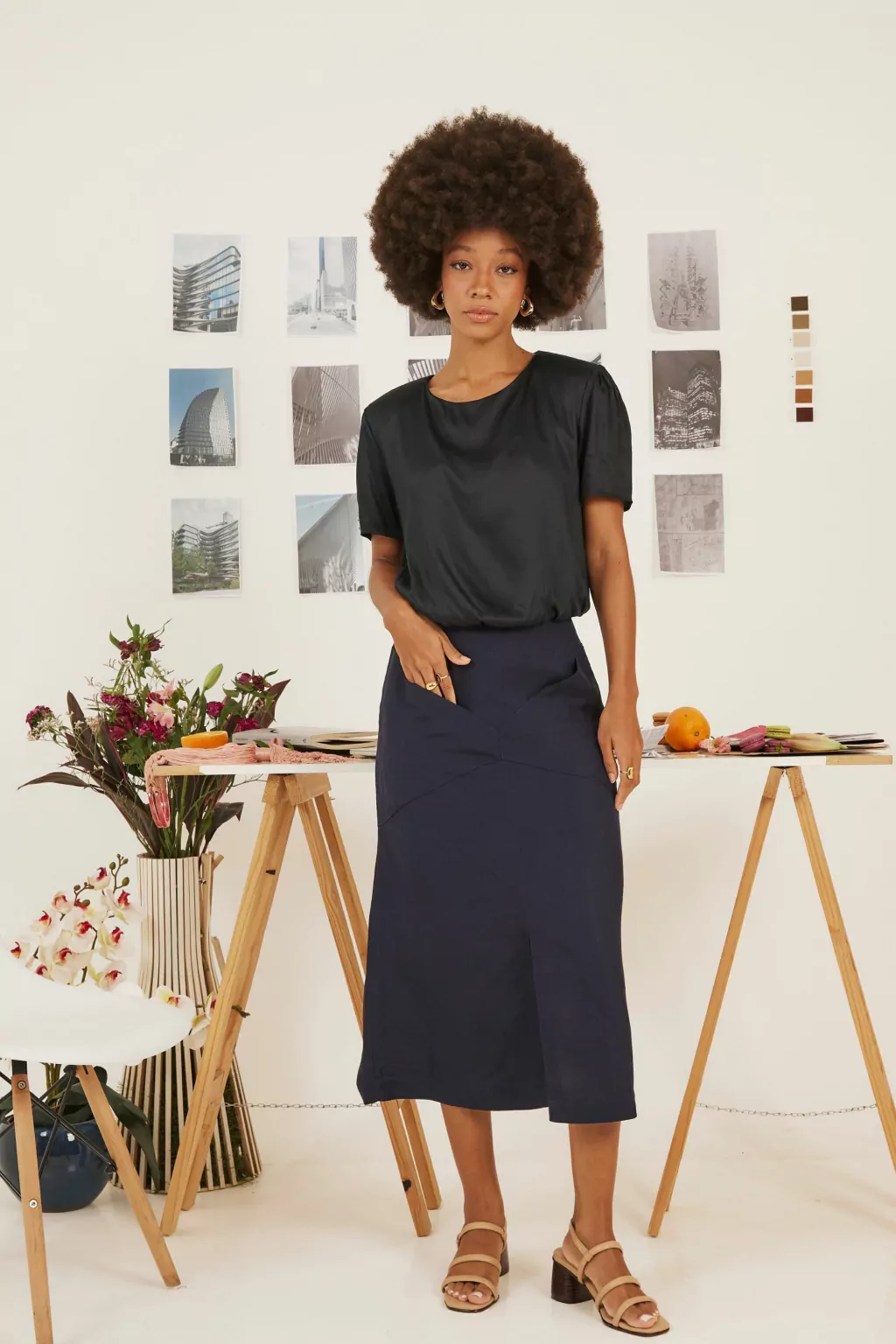Esta peça é confeccionada com a Viscose Lumi, um tecido 100% viscose, de toque acetinado e leveza incomparável. Com gramatura de 130 g/m², oferece um caimento fluido e suave, perfeito para os dias mais quentes. A viscose é um material respirável, garantindo frescor e conforto, sem abrir mão da elegância. Para preservar sua beleza e durabilidade, recomendamos lavar separadamente à mão e seguir todos os cuidados indicados ao receber a peça.