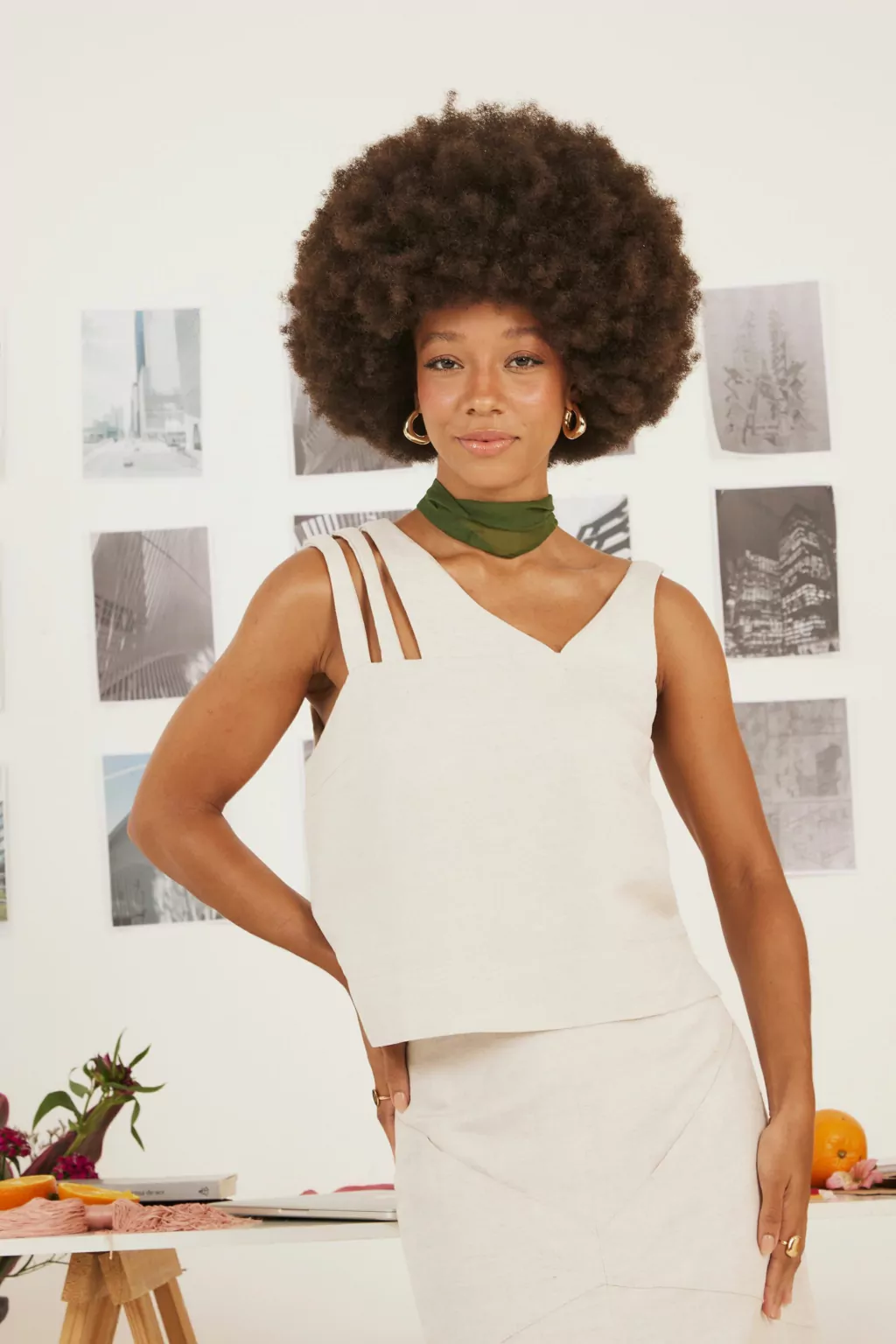 Esta peça é confeccionada com LinoVisco, um tecido leve e respirável composto por 55% linho e 45% viscose, que garante conforto durante o uso. O toque natural do linho, combinado com a suavidade da viscose, proporciona conforto e frescor sem abrir mão da elegância. Com uma gramatura de 170g/m², o material tem um toque suave e fluido, perfeito para os dias mais quentes. Além disso, o LinoVisco possui certificação Oeko-Tex, garantindo que não há substâncias prejudiciais ao meio ambiente em sua produção. Para preservar a beleza do tecido, recomendamos lavar a peça separadamente à mão e seguir todas as instruções de cuidados.