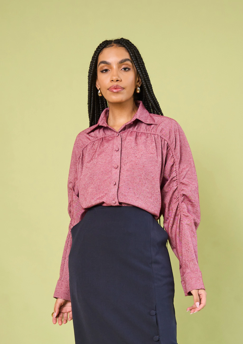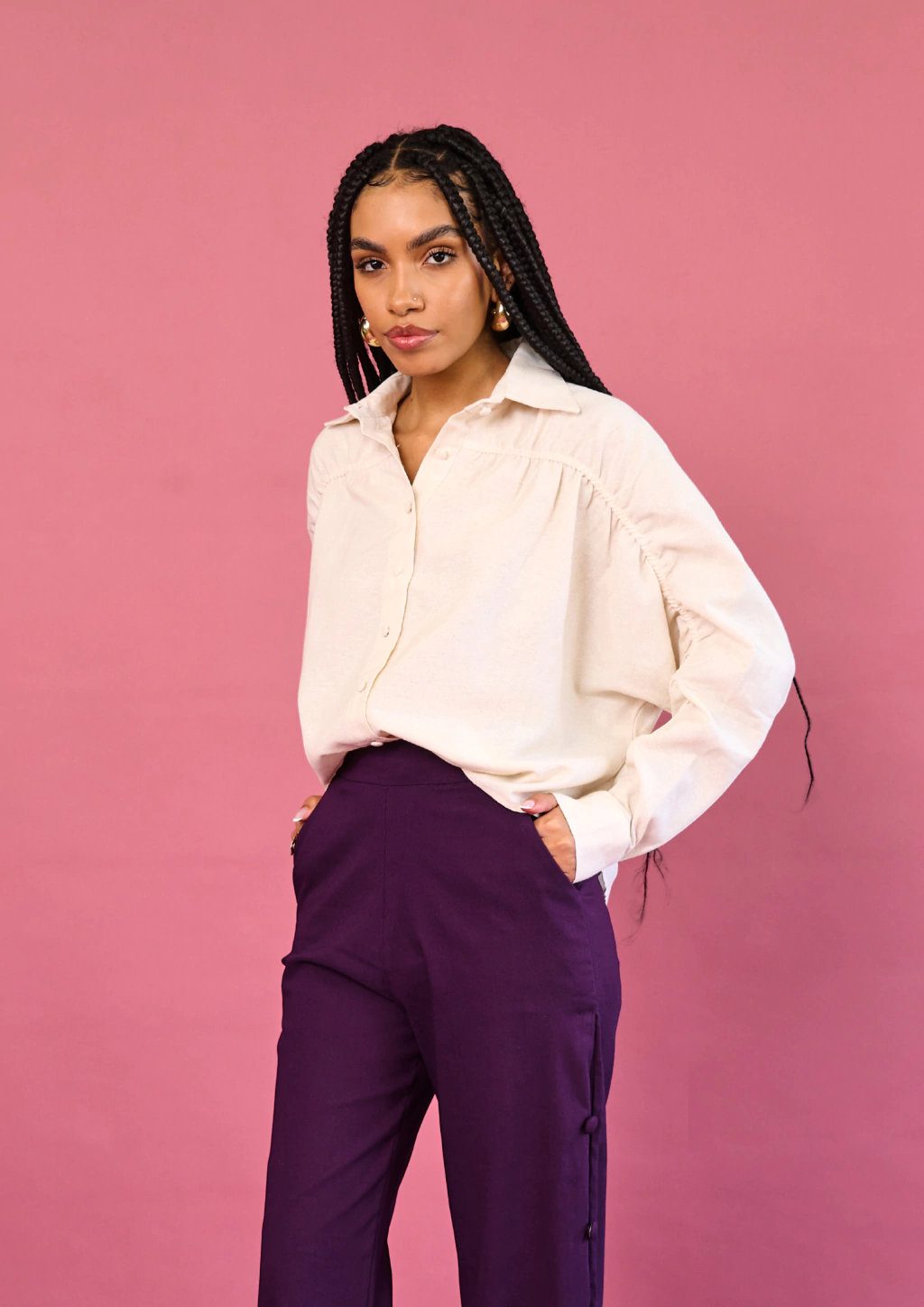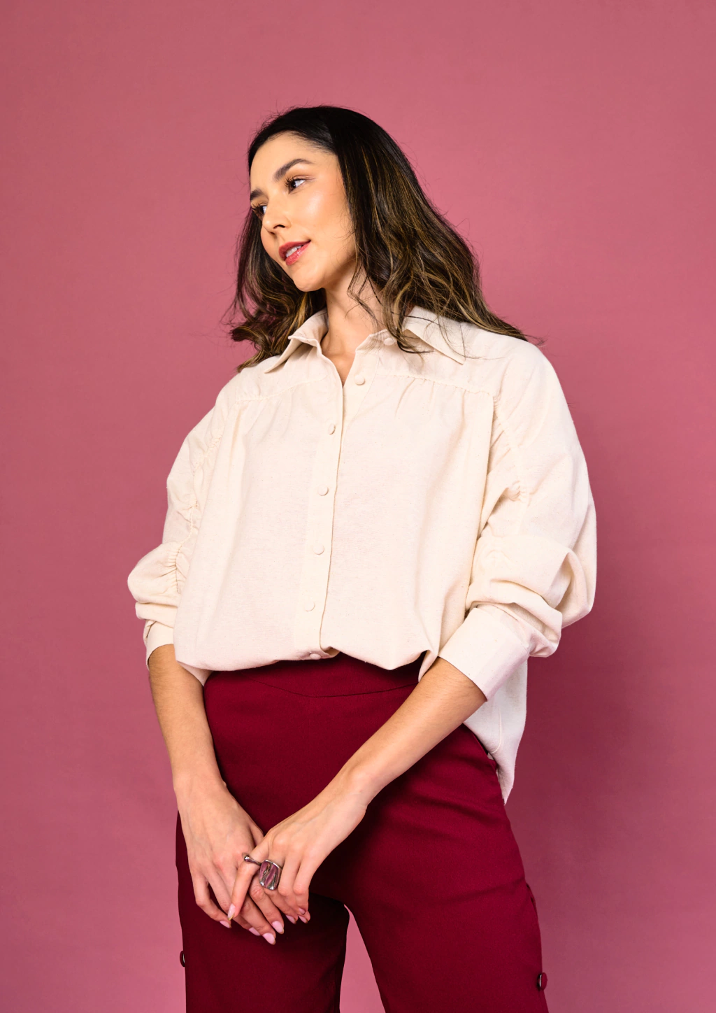 Com um caimento solto e versátil, o comprimento da Camisa Kat é ideal, ficando entre a cintura e o quadril para permitir o uso por dentro ou por fora da parte de baixo.