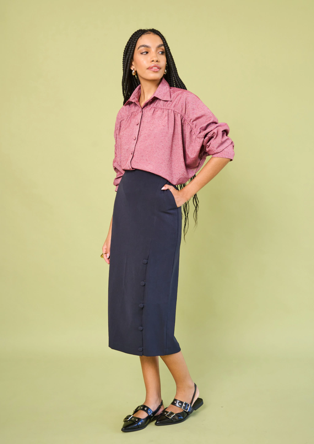 Com um design prático e elegante, a saia presenta bolsos funcionais na parte frontal, adicionando praticidade ao estilo. Na parte da frente, a fenda possui botões que podem ser usados abertos ou fechados, oferecendo versatilidade no visual.