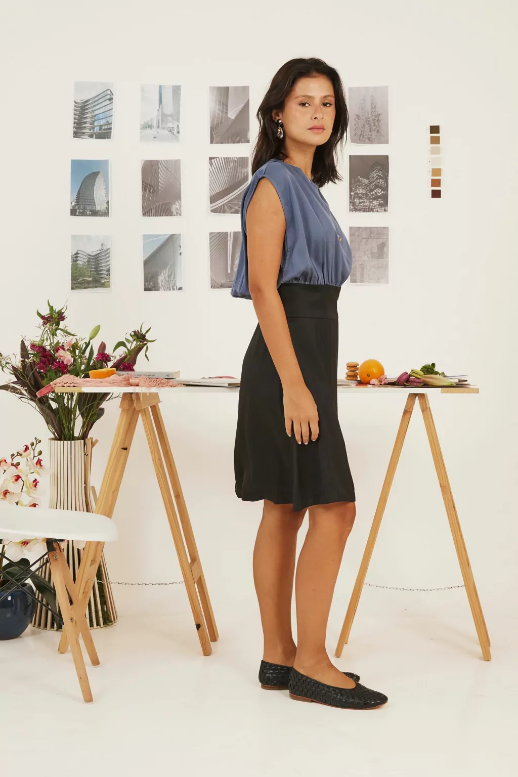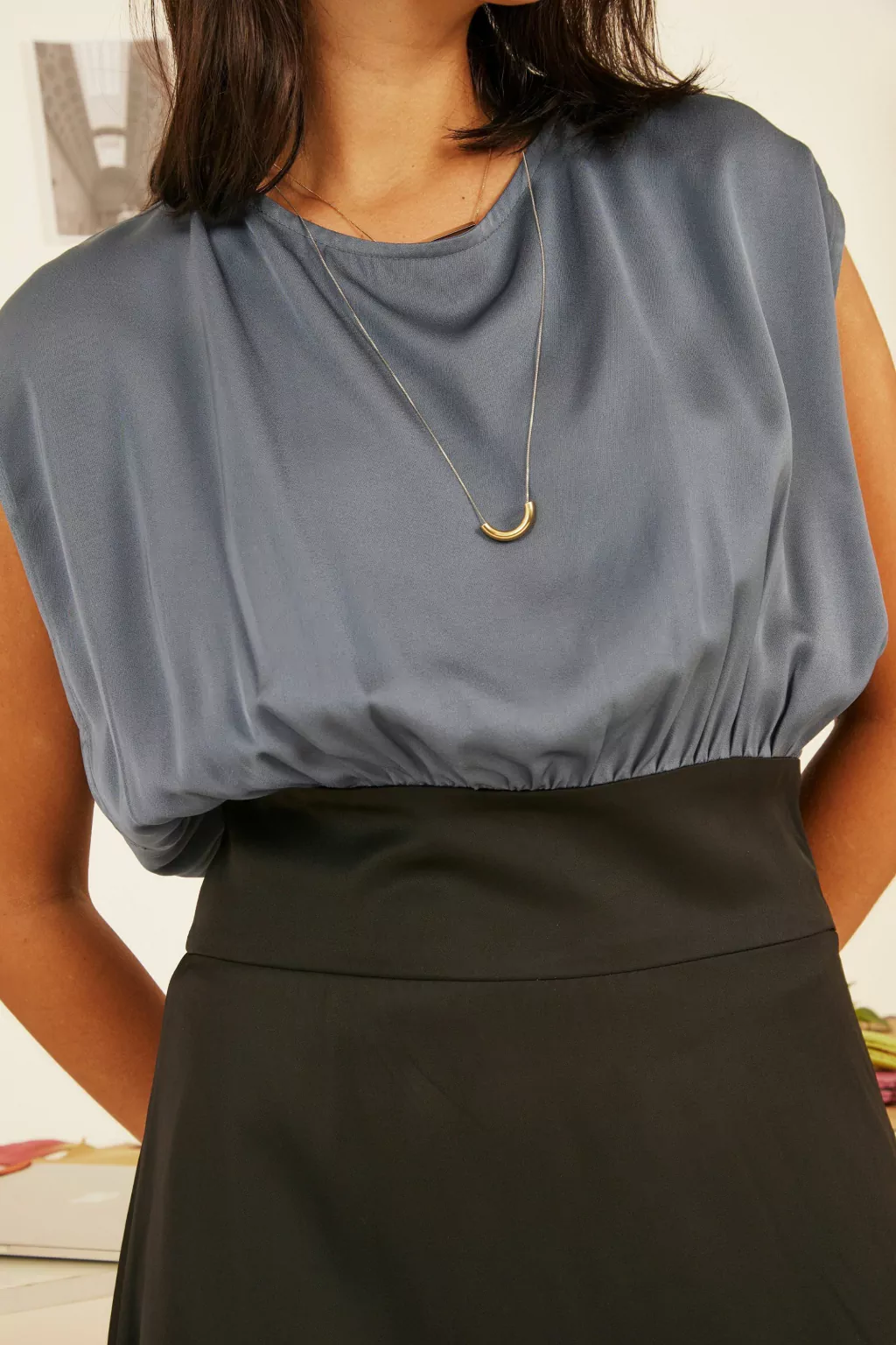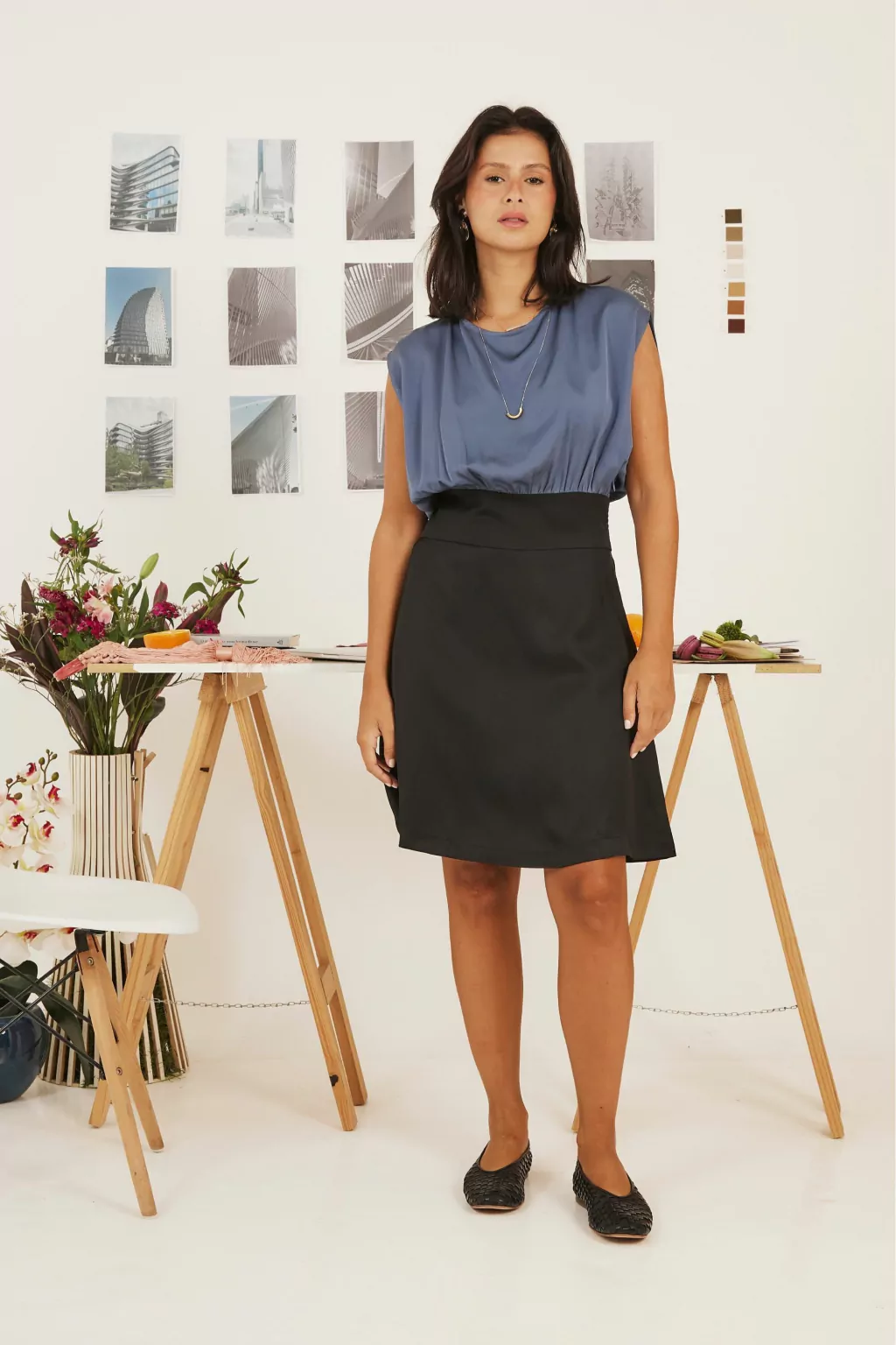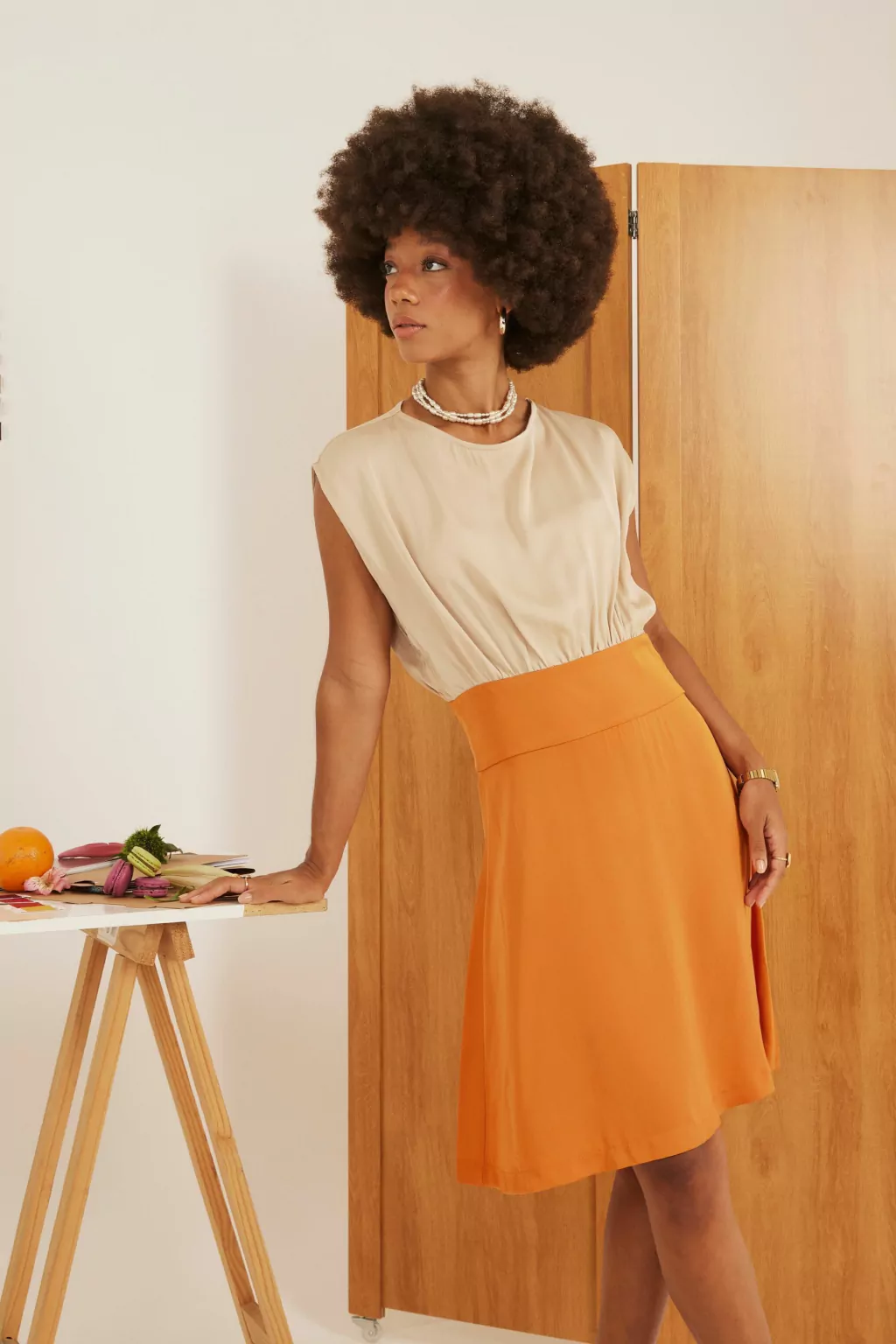 O Vestido Segmentos é uma peça moderna e cheia de estilo. Com comprimento acima dos joelhos, ele apresenta um design bicolor, com a parte superior em uma cor e a parte inferior em outra, criando um contraste visual interessante. A parte de cima tem um caimento mais fluido e a cintura é delicadamente marcada, proporcionando um ajuste impecável. A parte de baixo tem um corte amplo, que garante movimento e leveza à peça. Fechamento com zíper lateral e botão atrás. Perfeito tanto para ocasiões informais quanto para as mais sofisticadas, o Vestido Segmentos oferece conforto e elegância de forma única.